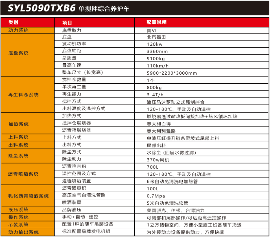 SYL5090TXB6 單攪拌綜合養(yǎng)護車是一款集現(xiàn)場生產(chǎn)新瀝青混合料、瀝青路面冷料、 舊料、銑刨料 100%現(xiàn)場加熱再生利用 ,熱瀝青灑布、裂紋跟蹤灌縫、乳化瀝青噴灑、為其他裝置提供電力和液壓動力等多種功能于一體的瀝青路面熱再生綜合養(yǎng)護車??蓪崿F(xiàn)多 場合、多路面的各種類養(yǎng)護作業(yè) ,養(yǎng)護修補費用低 ,作業(yè)快捷 ,高效率、節(jié)能環(huán)保性能突 出等特點。適用于市政、? 國省道路、鄉(xiāng)村公路、廠區(qū)、園區(qū)等狹窄區(qū)域瀝青路面小型養(yǎng)護修補施工。