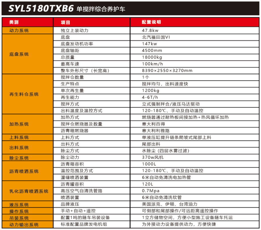 SYL5180TXB6 單攪拌綜合養(yǎng)護(hù)車是一款集現(xiàn)場生產(chǎn)新瀝青混合料、瀝青路面冷料、 舊料、銑刨料 100%現(xiàn)場加熱再生利用 ,熱瀝青灑布、裂紋跟蹤灌縫、乳化瀝青噴灑、為 其他裝置提供電力和液壓動(dòng)力等多種功能于一體的瀝青路面熱再生綜合養(yǎng)護(hù)車??蓪?shí)現(xiàn)多 場合、多路面的各種類養(yǎng)護(hù)作業(yè) ,養(yǎng)護(hù)修補(bǔ)費(fèi)用低 ,作業(yè)快捷 ,高效率、節(jié)能環(huán)保性能突 出等特點(diǎn)。適用于遠(yuǎn)郊較寬闊區(qū)域中小施工量和高速公路的修補(bǔ)施工。
