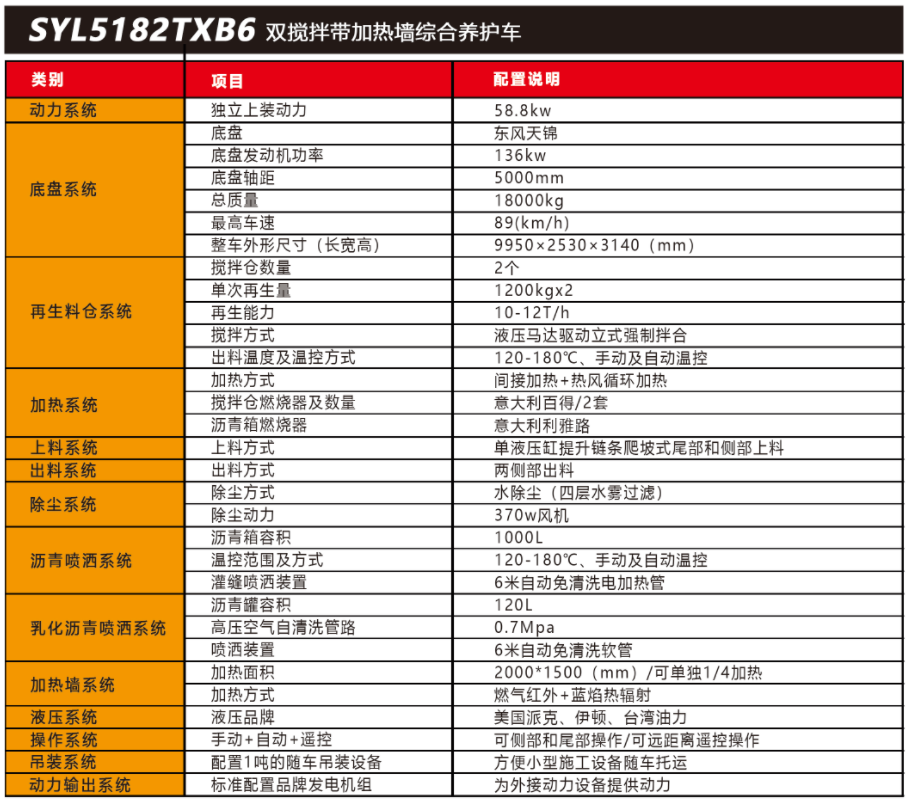 SYL5182TXB6 雙攪拌帶加熱墻路面綜合養(yǎng)護(hù)車是一款集現(xiàn)場生產(chǎn)新瀝青混合料、瀝 青路面冷料、? 舊料、銑刨料 100%現(xiàn)場加熱再生利用 ,熱瀝青灑布、裂紋跟蹤灌縫、乳化 瀝青噴灑、為其他裝置提供電力和液壓動力等多種功能于一體的瀝青路面熱再生綜合養(yǎng)護(hù) 車。配置智能燃?xì)饧t外線加熱墻 ,可輕松對路面進(jìn)行全方位加熱 ,可實(shí)現(xiàn)多場合、多路面 的各種類養(yǎng)護(hù)作業(yè)。養(yǎng)護(hù)修補(bǔ)費(fèi)用低 ,作業(yè)快捷 ,高效率、節(jié)能環(huán)保性能突出等特點(diǎn)。主要適用于多種路況的中大施工量和高速公路的修補(bǔ)施工。